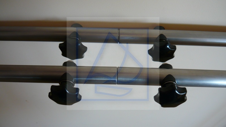 Montaż i demontaż masztu do pawęży za pomocą 4 śrub nierdzewnych zakończonych nakrętkami motylkowymi. Maszt można rozłożyc na 2 połowy odkręcając górne śruby. Grubość pawęży 4 cm