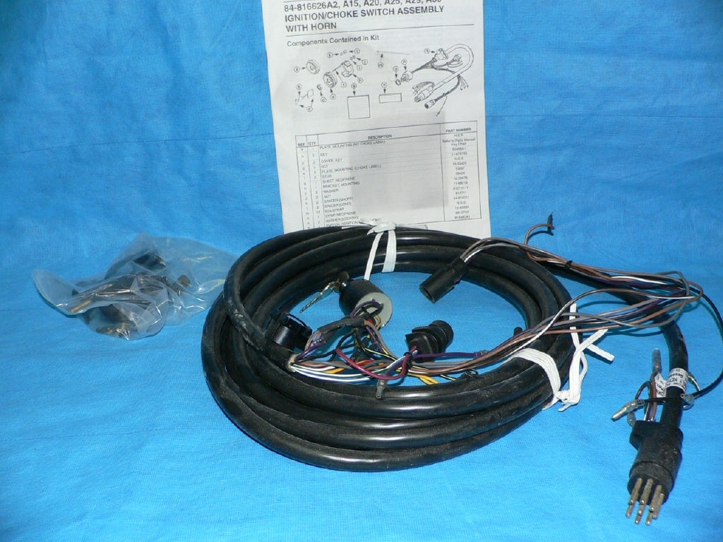 Oryginalna stacyjka Mercury / Quicksilver ze ssaniem w kluczyku (przez przyciśnięcie) , z buczkiem alarmowym oraz kablem długości 6 m do podłączenia silnika Mercury/Mercruiser ze złączką 8-pinową (stosowana do 2004 roku) .
