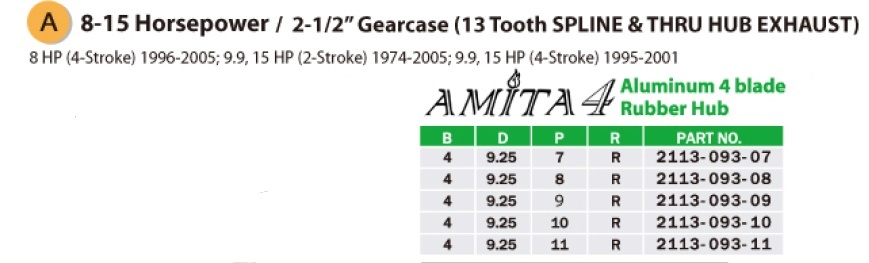 Śruba 4 płatowa AMITA 4 przeznaczona do silników z wydechem spalin przez piastę (pod wodą) pasuje do następujących silników (kolor śruby czarny)
